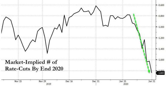 欧洲也出现了大规模的降息押注。据悉,一名交易员1月27日买了近10万份3月到期的欧元银行间拆借利率(euribor)futures,押注欧洲央行将在3月中旬前降息。同时,对欧洲央行2020年降息概率的预期突然从前一周的0%大幅飙升至50%。此前市场同样预期欧洲央行将一直按兵不动到2021年。